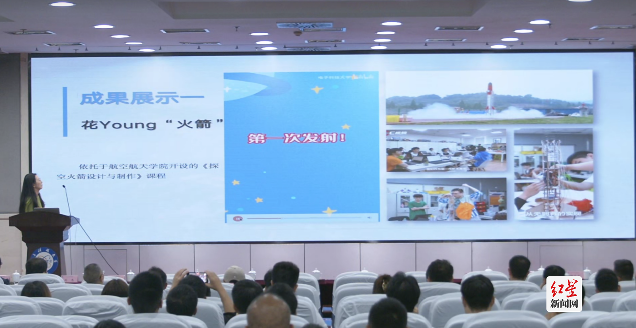 启动仪式后,“北斗·成电教育论坛”上来自电子科技大学竞赛中心的闫冬雪老师,以“科学教育引航青春梦想”为主题,从时代变革、多元升学、学在成电、成果展示等几个方面阐述白名单竞赛、高质量研学、科学科普训练营等多元因素对新高考的影响。并向参会领导、嘉宾展示了电子科技大学航空航天学院开设的《探空火箭设计与制作》课程成果、电子科技大学机器人队的被称为“西南大魔王”小兔和大象机器人等多项教学科研成果。